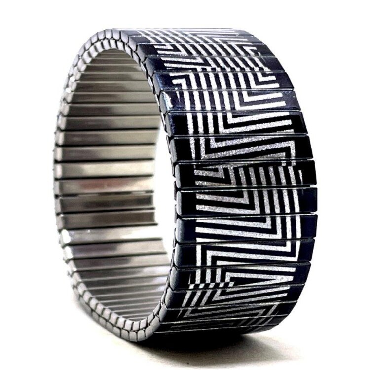 Stainless steel designer bracelet 22mm handmade in London - Zigzag silver on black Metallic