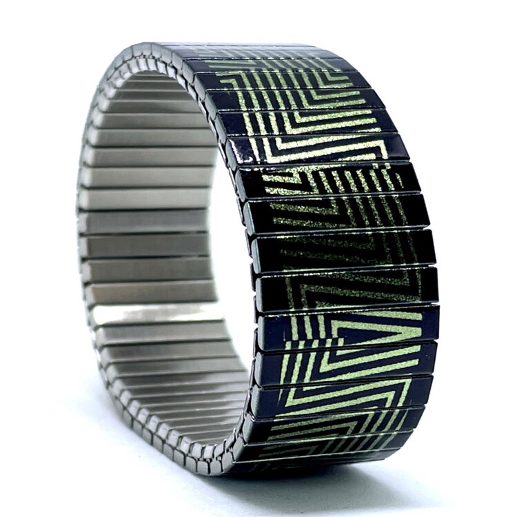 Stainless steel designer bracelet 22mm handmade in London - Zigzag green on black Metallic